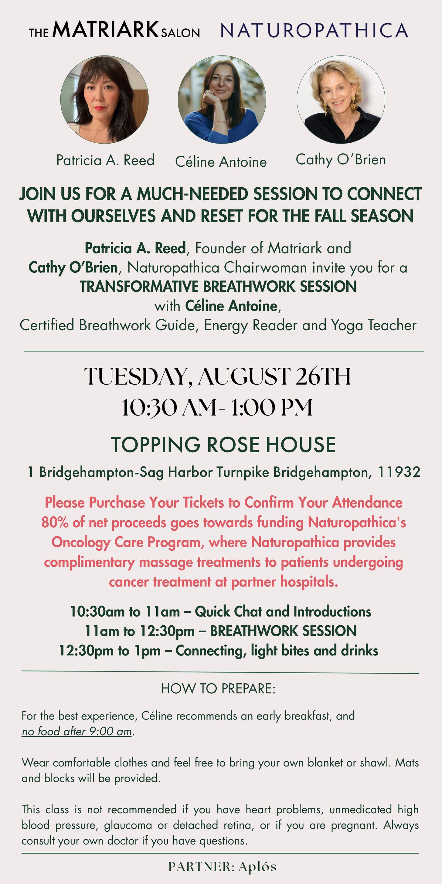 Join us at the Topping Rose House for a much-needed session with Céline Antoine to connect with ourselves and reset for the Fall season. Patricia A. Reed, Founder of Matriark and Cathy O’Brien, Naturopathica Chairwoman invite you for a TRANSFORMATIVE BREATHWORK SESSION with Céline Antoine, Certified Breathwork Guide, Energy Reader and Yoga Teacher.